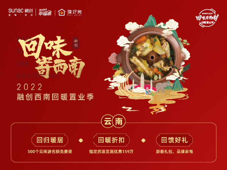 2022年1月13日,以“回味寄西南”为主题的融创西南2022回暖置业季正式启动。沿循春节时光轴线,融创西南回暖置业季以“寄想念”、“寄团圆”、“寄暖居”三大主线,层层递进,携西南五省臻选百盘,共迎新春。