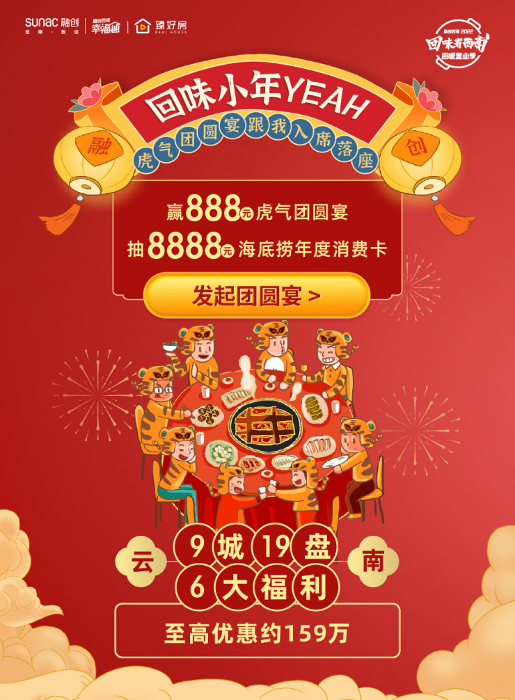 排名前列启动活动以“寄想念”为核心,融创西南联动顺丰中国,在线送百元顺丰运费礼包助全国网友“寄年味回西南”。2022年1月20日,融创西南“寄团圆·回味小年yeah”主题活动正式上线,再送“虎”利。网友参与游戏互动,即可赢价值888元虎气团圆宴,更有机会抽取8888元「海底捞年度消费卡」!融创云南也准备了专属暖居置业好礼,送上新春福利。