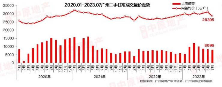 据广州中原研究发展部监控的数据显示,2023年7月,广州市二手住宅成交量(自助网签+中介网签)为8096宗;环比2023年6月同期(8292宗)下降2.4%,同比去年7月上涨6.6%。价格方面,7月二手网签均价为28395元/㎡,环比上月下跌8.6%。
