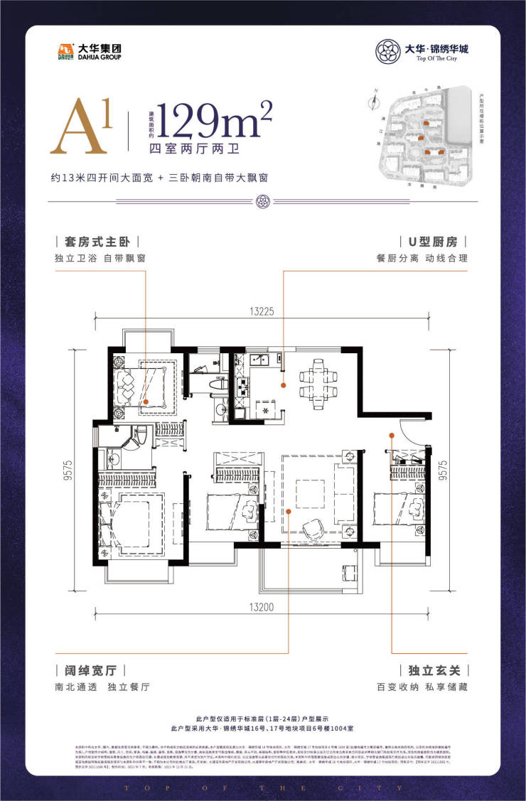 建筑面积约129㎡奢阔四房,作为王牌户型居住舒适度尤为突出,约13米四开间大面宽,采光通风条件优越。独立餐厅+U型厨房,共享美好食光。三卧朝南带飘窗,宽景视野各得其乐,同时也满足三代同堂的幸福需求。安家大华,红盘实力不惧比,抓紧入手,理想生活一步到位。