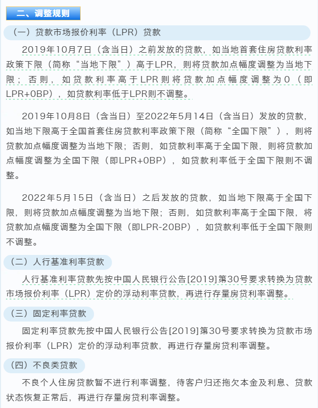 ①原贷款发放时,执行所在城市首套房贷利率政策且当前为LPR定价的浮动利率存量房贷,各大银行将主动按规则统一批量调整贷款利率;②原贷款发放时执行二套房贷利率标准,当“二套转首套”的存量房贷,或不良贷款归还积欠本息的存量房贷,需由客户向银行主动申请利率调整;③当前执行固定利率或基准利率定价的存量房贷,需由主动申请利率调整,先转换为LPR定价的浮动利率贷款,再按调整贷款利率。