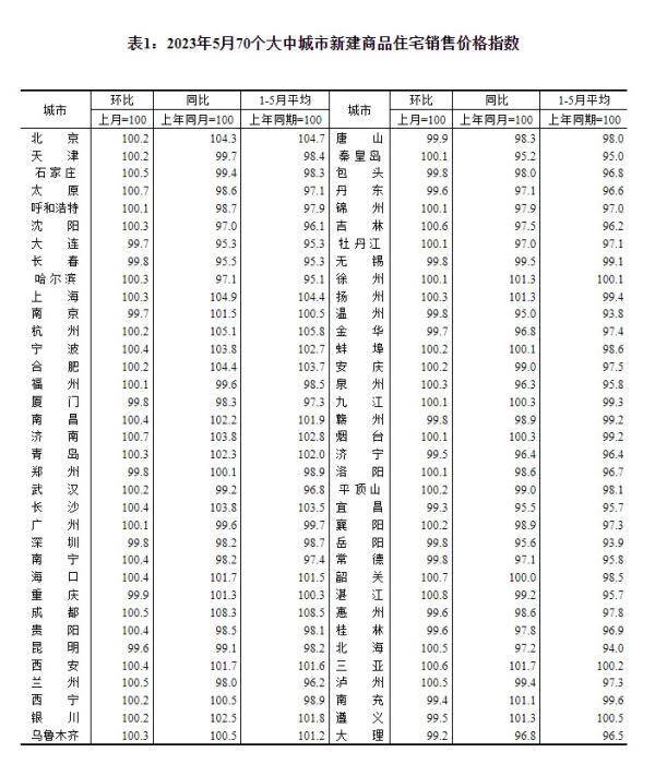 2023年5月70个大中城市新建商品住宅销售价格指数。 截图自国家统计局官网