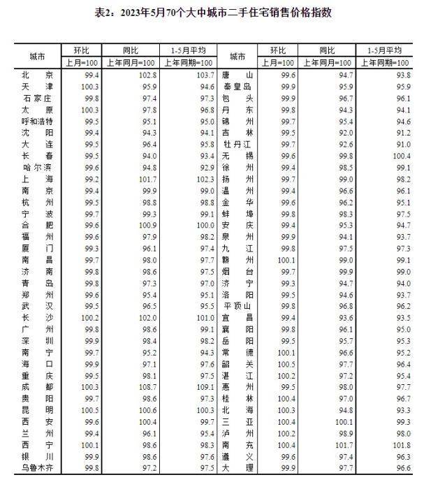 2023年5月70个大中城市二手住宅销售价格指数。 截图自国家统计局官网