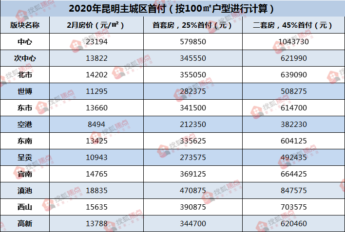 按照昆明锐理的数据,焦点君计算出了昆明主城各板块的首付,按100㎡房源,首付25%计算,首付在22-58万之间。