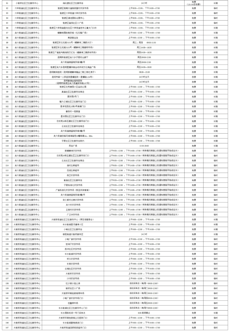 ① 目前,全市共有常态化免费核酸检测点位201个,原则上统一工作时间(9:00—12:00;14:00—17:00);昆明市指挥部有新要求的,按照指挥部要求的工作时间严格执行。