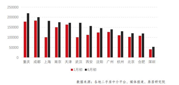 从绝对规模来看,重庆、成都和上海的二手房挂牌量规模相对大,6月初分别为22万套、20万套和18万套。