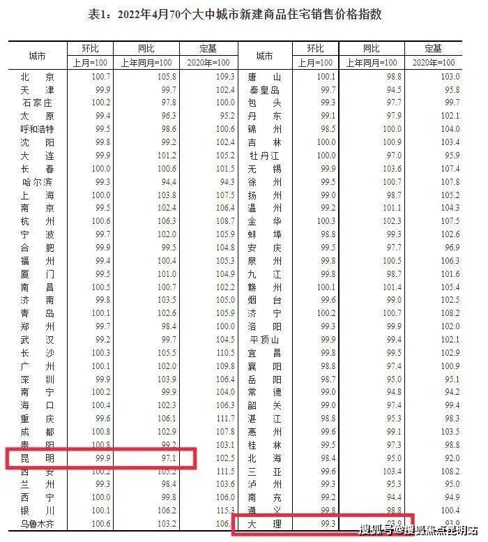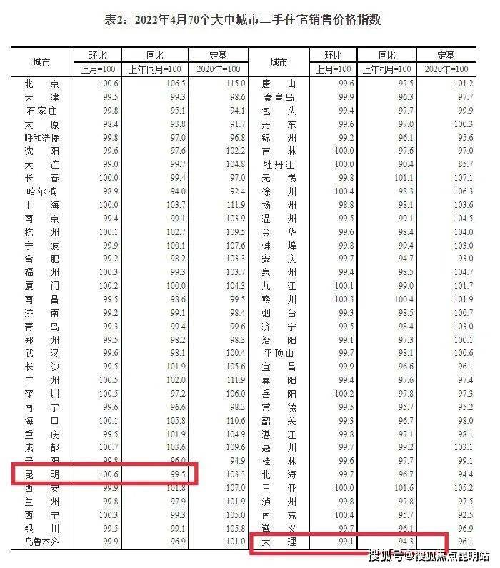 5月18日,国家统计局公布2022年4月份70个大中城市商品住宅销售价格数据。根据4月数据,昆明新房房价环比下跌0.1%,同比下跌2.9%。大理4月新房房价环比下跌0.7%。