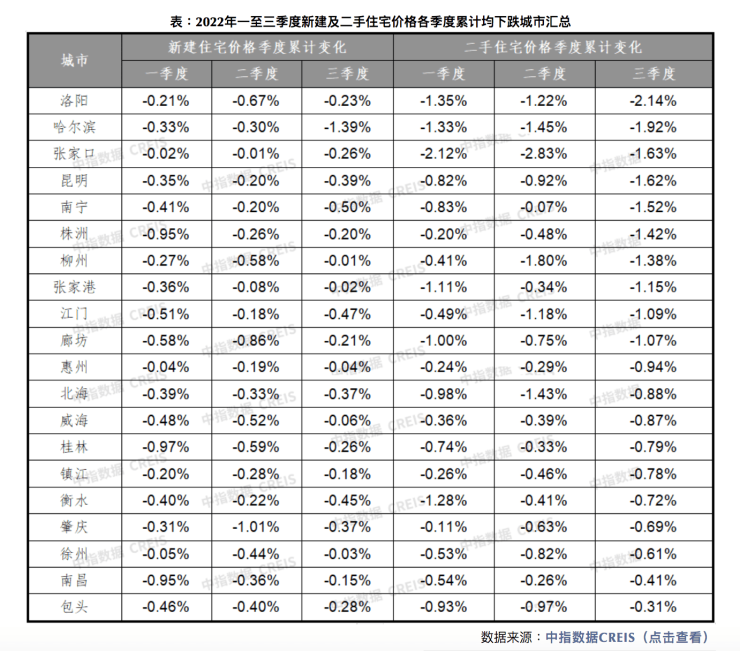综合前三季度表现来看,新建住宅方面,三季度,百城新建住宅价格累计下跌的城市数量为62个,较二季度增加7个。二手住宅方面,共73个城市二手住宅价格累计下跌,数量较二季度增加13个。自年初以来,哈尔滨、昆明、南宁等20个城市新建及二手住宅价格各季度累计均呈下跌态势。