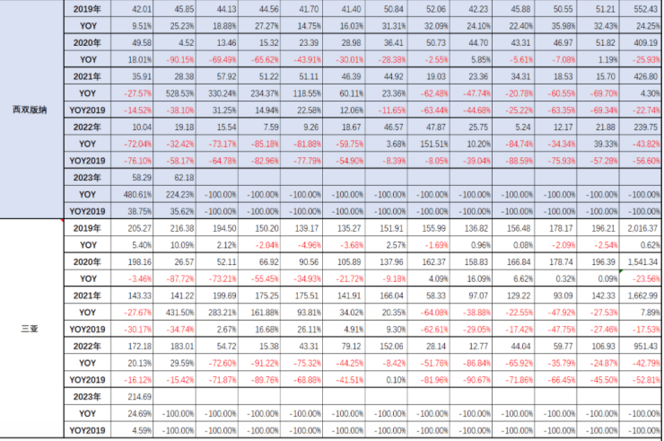 景鉴智库提供了一份2023年机场旅客吞吐量对比数据,西双版纳机场到访人数1月同比增加481%、2月同比增加224%,和2019年同期相比增加38.75%。
