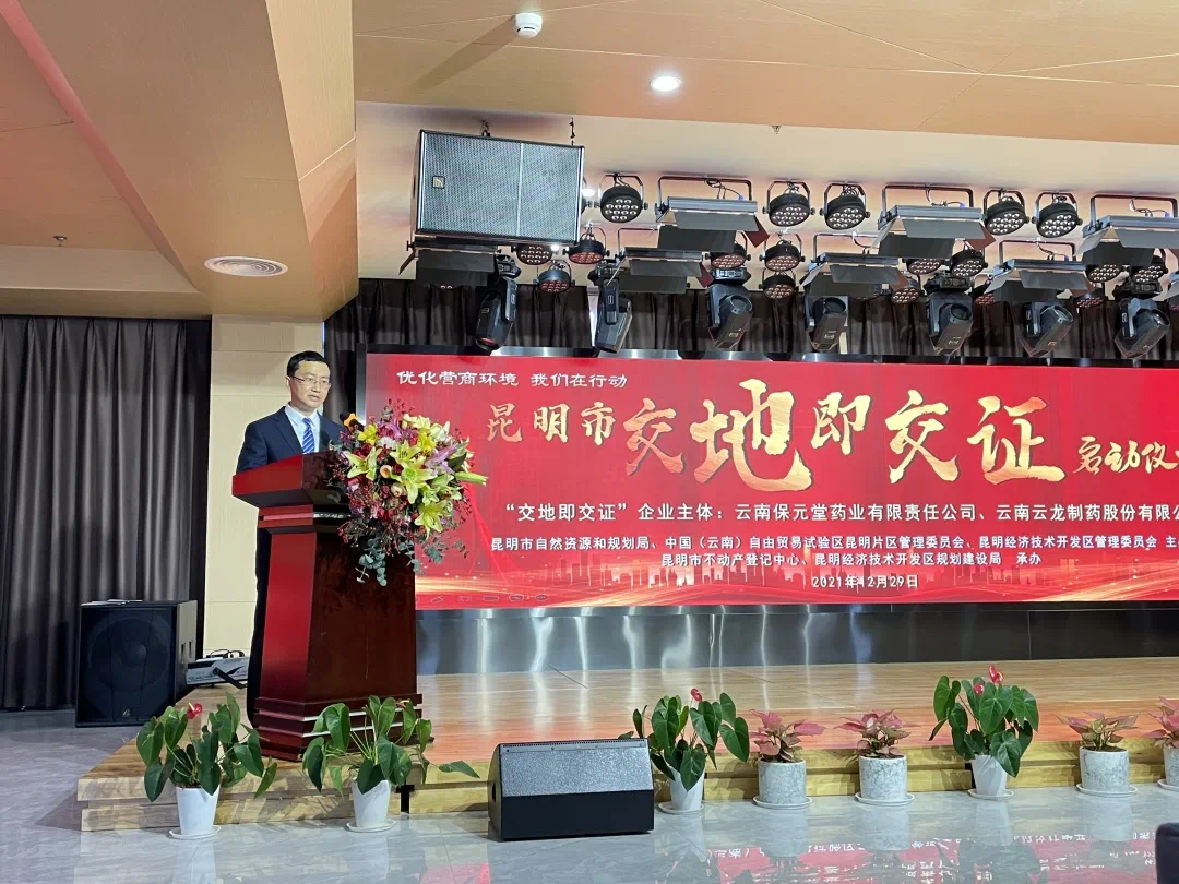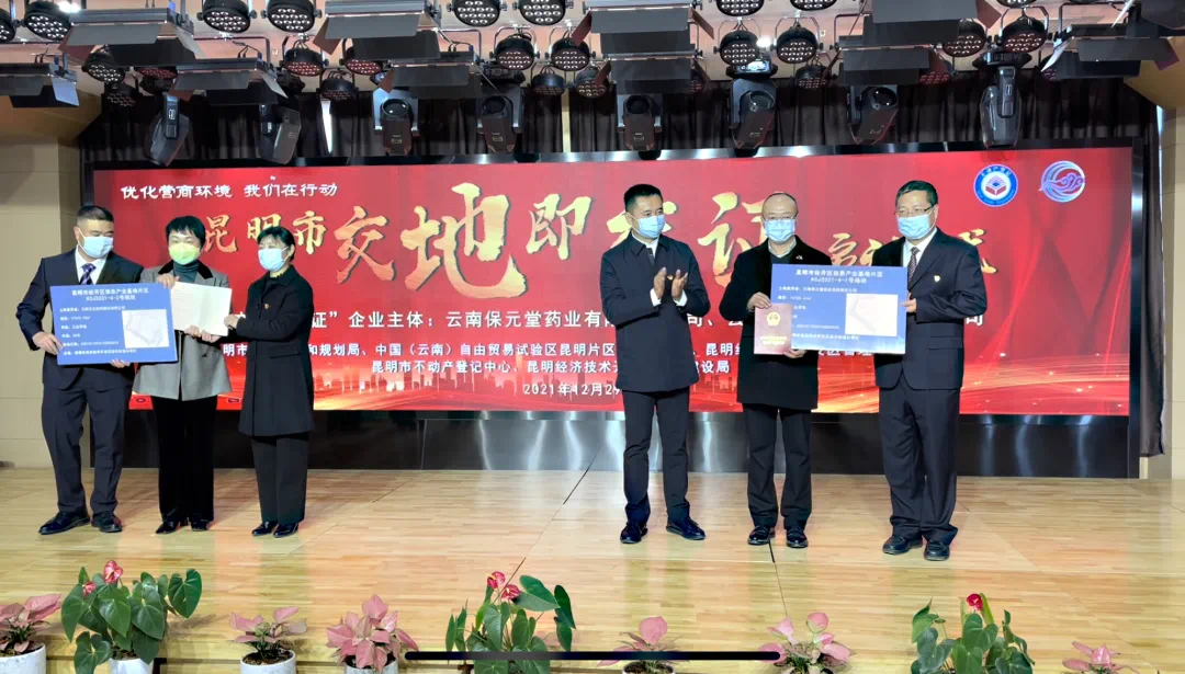 12月29日下午,昆明市自然资源规划局、昆明市不动产登记中心、中国(云南)自由贸易试验区昆明片区管理委员会、昆明市经济技术开发区管理委员会和经开区规划建设局,在自贸区昆明片区向云南保元堂药业有限责任公司、云南云龙制药股份有限公司项目用地推出“交地即交证”改革服务措施,云南保元堂药业有限责任公司、云南云龙制药股份有限公司两家企业取得土地使用权的同时,领取了国有建设用地使用权不动产权证书。“交地即交证”工作的实施,标志着昆明登记财产营商环境改革迈入新阶段。