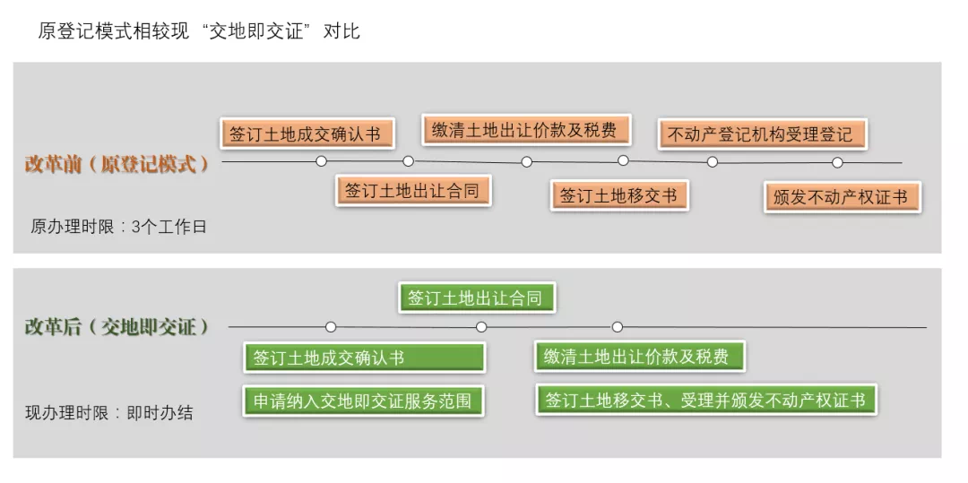 “交地即交证”这一重要改革举措的实施,旨在深化“放管服”改革和优化提升登记财产营商环境,调整企业取得土地使用权后申请办理不动产权证的流程,增强用地企业的获得感。即用地企业通过“招拍挂”公开出让取得国有建设用地使用权后,不动产登记机构及辖区政府职能部门主动作为,提前介入,靠前服务,在签订出让合同并按时缴清土地出让金及相关税费,向用地企业移交土地的同时,颁发不动产权证书。