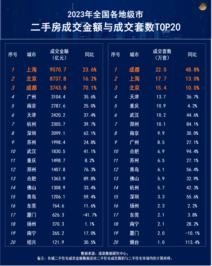 此外,2023年二手房成交金额及成交套数TOP20城市中,上海、北京、成都占据成交量及成交金额双榜单前三,上海、北京分别以9570.7亿元、8737.8亿元排前两位,分别较上年上涨23.6%、16.2%;成都以3743.8亿元排在第三,成交套数上则位于榜首,二手房市场延续活跃状态。