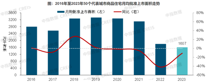 此外,房企供货能力、供货意愿不足。据中指研究院监测,50个代表城市2023年商品住宅批准上市面积同比下降超10%,月均批准上市面积约1600万平方米,同比下降约11%,供给端表现整体偏弱。而在供需均走弱的背景下,重点50城整体表现供小于求。据初步统计,2023年,50个代表城市商品住宅月均新增供应约1600万平方米,同期月均成交面积为1955万平方米,销供比为1.22,高于2022年水平。