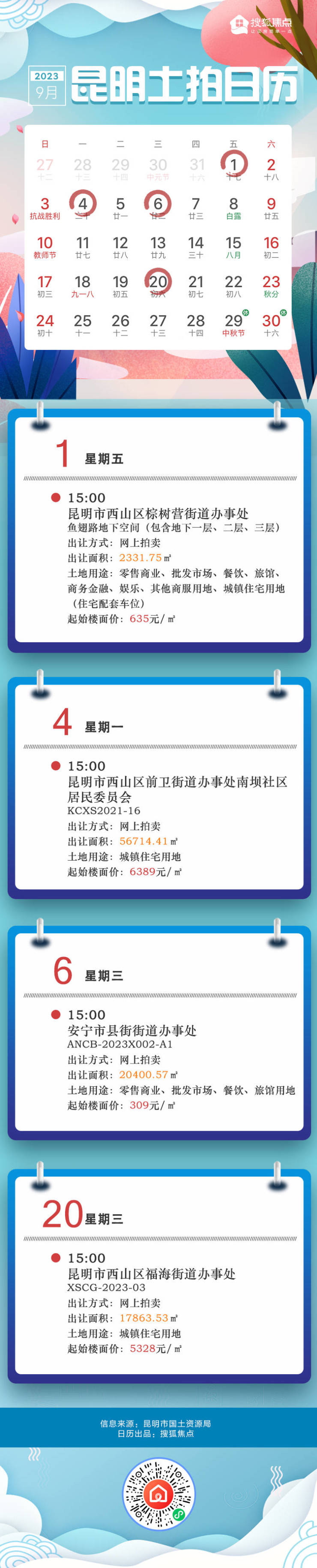 #焦点土拍日历 9月昆明主城五区及周边区县共供地4宗,总面积约145.96亩。