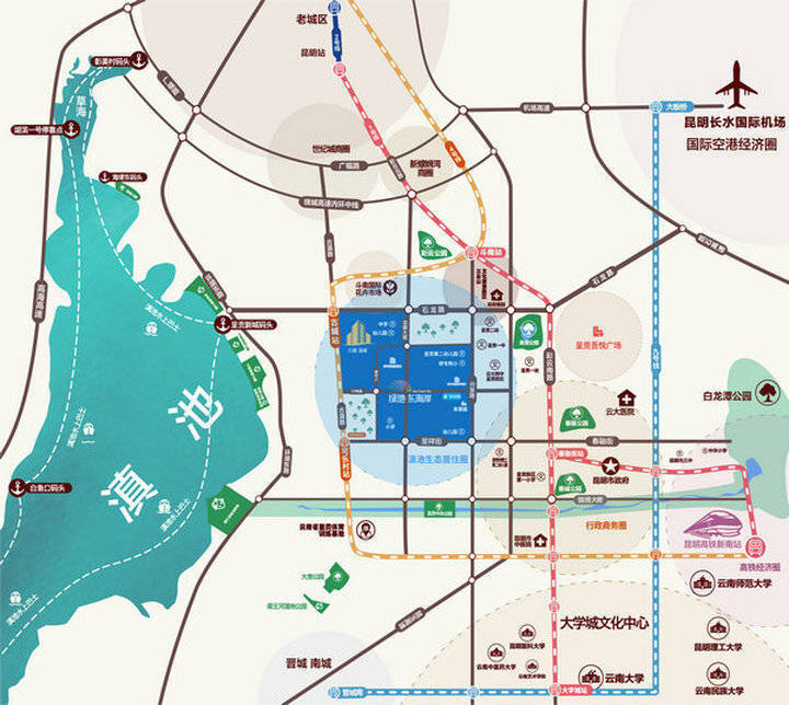 查看地图,不难发现绿地.东海岸是滇池边稀有的涵盖商业、办公、酒店、住宅等多种业态于一体的城市综合体,总建面约220万方,自带35万方商业集群,除了呈贡唯一的沃尔玛之外,汇集众多品牌商家的东海岸购物公园全面运营;已开通的地铁4号线古城站下楼即达,与1号线、多条公交以及快速通达的高铁、机场线路优势互补、联动发展,不断激发内生动力,造就自身新优势,吸引了诸多的人流、物流、资金流、信息流,促进了区域综合竞争力的快步提升,构建出一个黄金半小时经济圈。