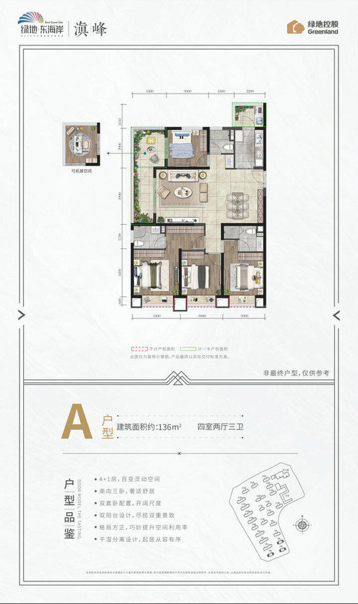 说到目前昆明的科技健康住宅,虽然各家风格迥异,但归根结底都是为业主全方位服务。这一点,绿地.东海岸也做了大尺度的尝试,尤其是在设计“滇峰”时,对标世界水平,推出了“绿健百科”产品体系,以居住者的身心感受为原点,融合健康与智慧的绿地科技健康宅2.0“四居四全”产品体系、8大全优技术模块、360°全呵护系统,实现了绿居、安居、宜居、云居“四居”社区生活,构建了全区净化、全区智能、全区安全、全区颐养“四全”健康体系。翻开东海岸的设计图纸,不管是79㎡还是143㎡,都能看见科技健康宅的缩影,再加上健身房、茶吧、棋牌室、书房、儿童娱乐等百变空间,为生活营造出无限可能。