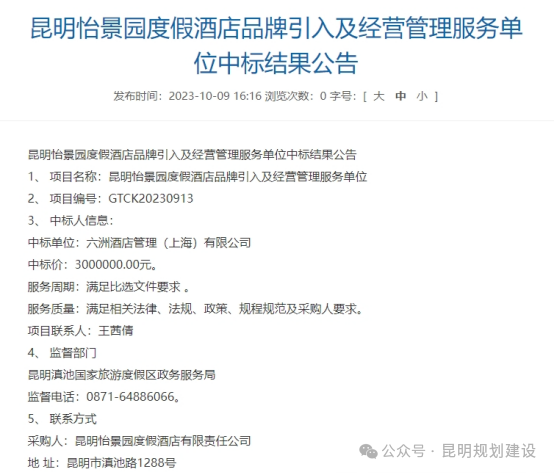 去年10月,滇池国家旅游度假区公布了怡景园酒店品牌引入及经营管理单位中标结果,六洲酒店管理(上海)有限公司中标。该公司为洲际酒店集团的全资子公司。