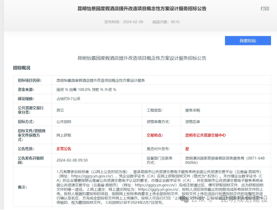 近日,昆明怡景园度假酒店公司发布“昆明怡景园度假酒店提升改造项目概念性方案设计服务”招标公告。