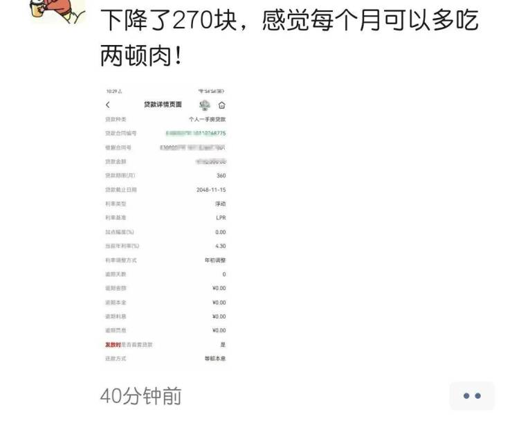 9月25日起,有不少市民查询到了住房贷款利率下调的消息,“下降了270块钱,感觉每个月可以多吃两顿肉!”李先生在朋友圈高兴地发布了自己住房利率下调至4.3%的消息。也有市民表示,自己的贷款利率调整到了4.0%。