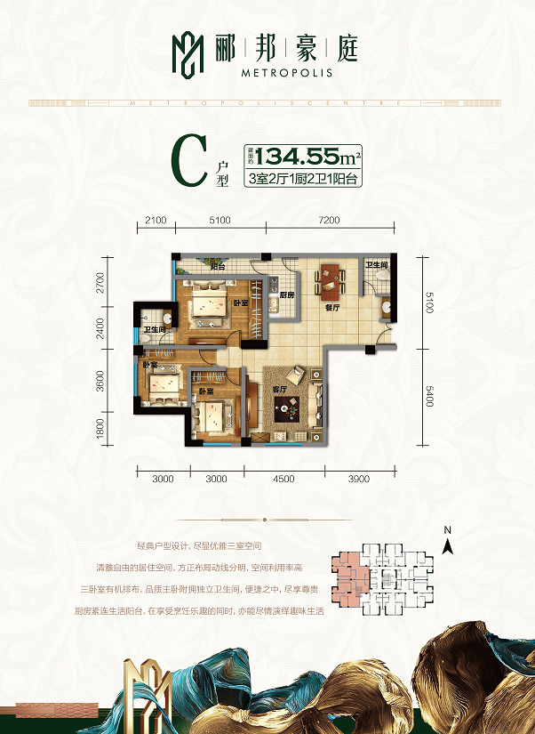 面积段约136㎡的三室两厅一厨两卫一阳台,经典户型设计,尽显优雅三室空间;清雅自由的居住空间,方正布局动线分明,空间利用率高;三卧室有机排布,品质主卧附拥独立卫生间,便捷之中,尽享尊贵;厨房紧连生活阳台,在享受烹饪乐趣的同时,亦能尽情演绎趣味生活。