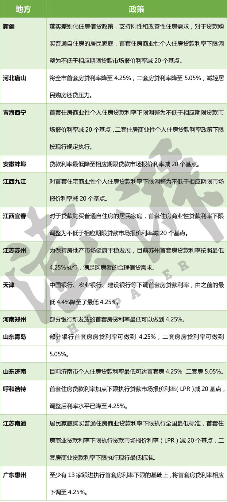 在降低首付、放开限购限售的同时,多地落实差别化住房信贷政策,支持刚性和改善性住房需求,多地首套房贷利率下调至4.25%。