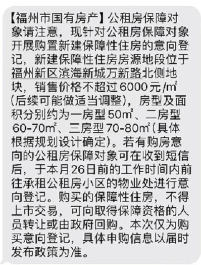 据了解,近期有福州公租房住户收到福州相关部门的购置新建保障性住房的意向登记短信。该短信显示,新建保障性住房房源地段位于福州新区滨海新城万新路北侧地块,销售价格不超过6000元/m(后续可能做适当调整),房型及面积分别约为一房型50m、二房型60-70m、三房型70-80m(具体根据规划设计确定)。