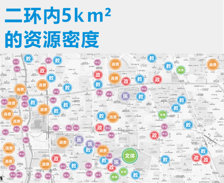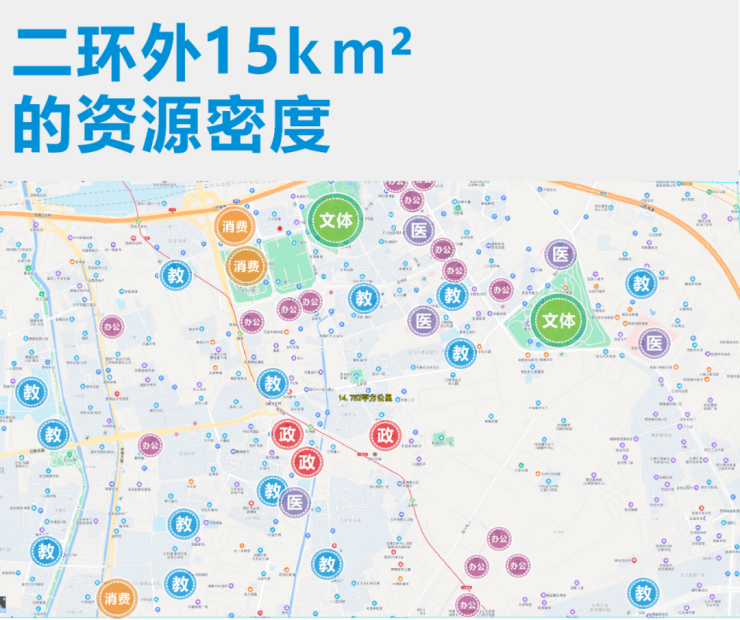 一个是省会核心的二环周边,在5平方公里的范围内,学校/医疗/行政/购物/办公的资源密度密密麻麻,体现了省会城市的荣光。