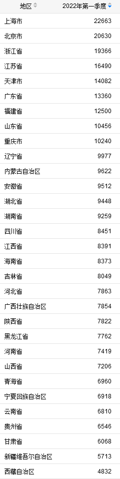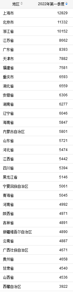 尽管上海3月份以来受到了疫情的冲击,但上海一季度居民人均可支配收入依然占据榜首。