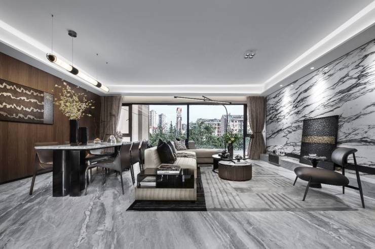 以锦粼天曜高定建面约143㎡户型为例,摈弃传统的空间布局,全新升维以LDKG设计理念为先导,模糊空间界限,减少墙面阻隔,形成餐厅、客厅、厨房、阳台四大公区融为一体的开放式格局,整个空间面积约42㎡,阔绰尺度,奢适无界,开放舒展,可以同时满足改善派对功能化和社交化的双重需求。