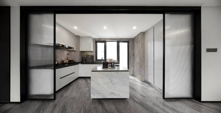 令人惊艳的是,就连厨房的面宽也做到了约4m,这可是建面约160-170㎡才能拥有的尺度。整个空间一体化非常大气,家人在下厨、用餐和客厅活动的充分融合,每个细节都照顾到家庭成员生活习惯。