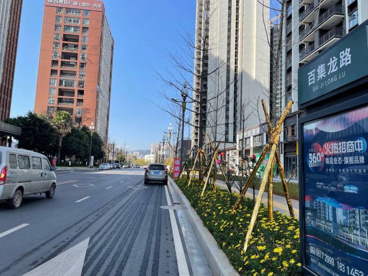 此前的百集龙路是一条双向2车道的简易小路,西侧的滇池一英里小区于去年底竣工,百集龙路有大约300米路段加宽为双向4车道的城市道路,颜值大幅提升,完全改变了城乡接合部的形象。