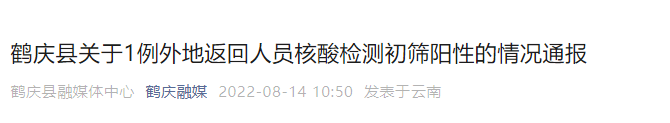刚刚!大理鹤庆通报:1例外地返回人员核酸检测初筛阳性