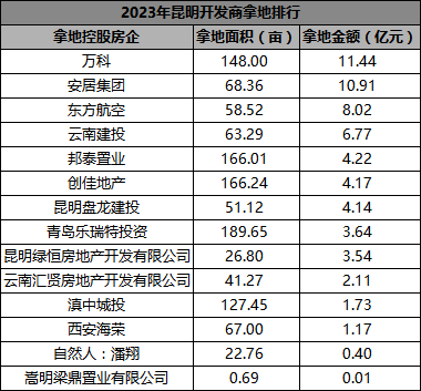 2023年在昆房企拿地表现依然不太积极,仅有10余个房企有所斩获,除了万科、邦泰两次拿地,其他房企均只拍过一次地。