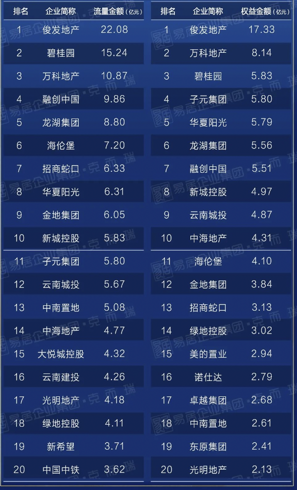 一季度昆明房企销售金额TOP20榜单显示,俊发地产以22.08亿元流量金额和17.33亿元权益金额稳居流量、权益金额榜单榜首。