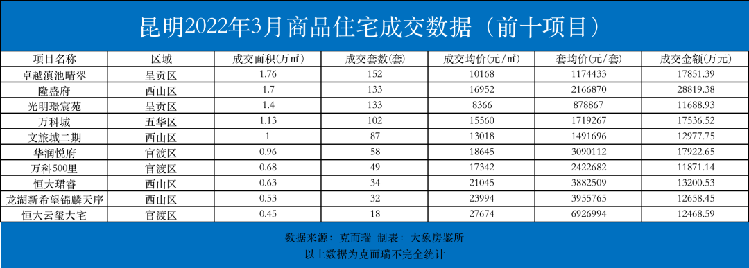 3月份昆明楼市销量前10名的住宅项目其中,销量排名排名前列的项目是先进滇池晴翠,3月份共成交152套,成交均价10168元/平方米,这是项目从开盘以来推出的较低价。