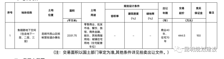 日前,昆明市自然资源和规划局发布《鱼翅路地下空间(包含地下一层、二层、三层)》土地拍卖出让公告。