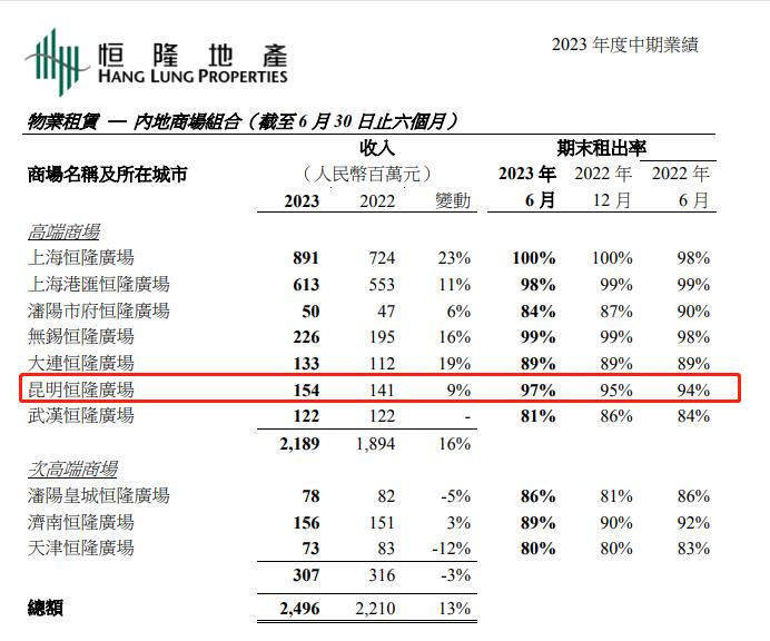 2023年7月,恒隆地产发布了《2023年度中期业绩》,其中,昆明恒隆广场收入同比增长9%、租户销售额同比增长8%。