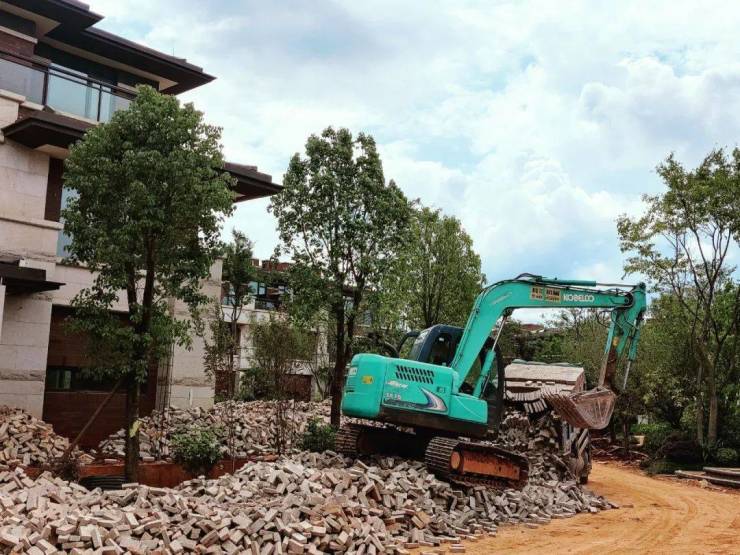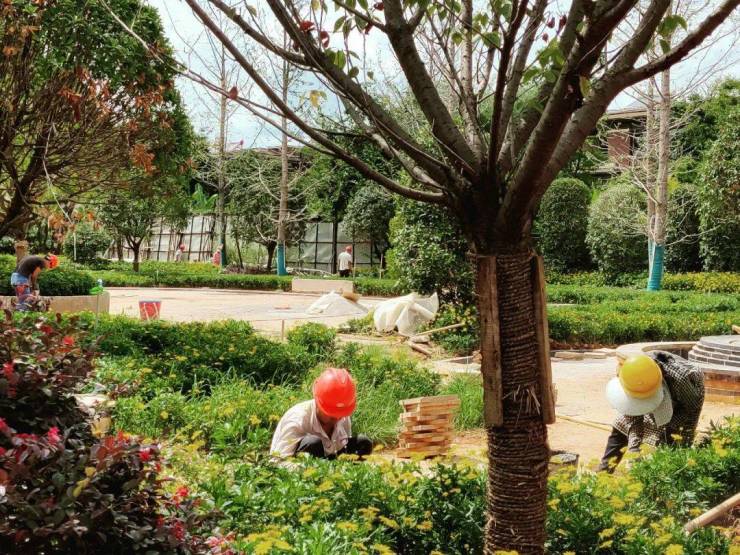8月30日下午3点左右,记者在恒大云玺五区看到,现场堆放着大量的绿植与墙砖。工作人员称目前已有三个工作队约上百人进场,负责不同的工作。现场正在进行小院围墙建设以及抹灰,七八名工人正在种植绿植,五区内部的绿植已基本成型。
