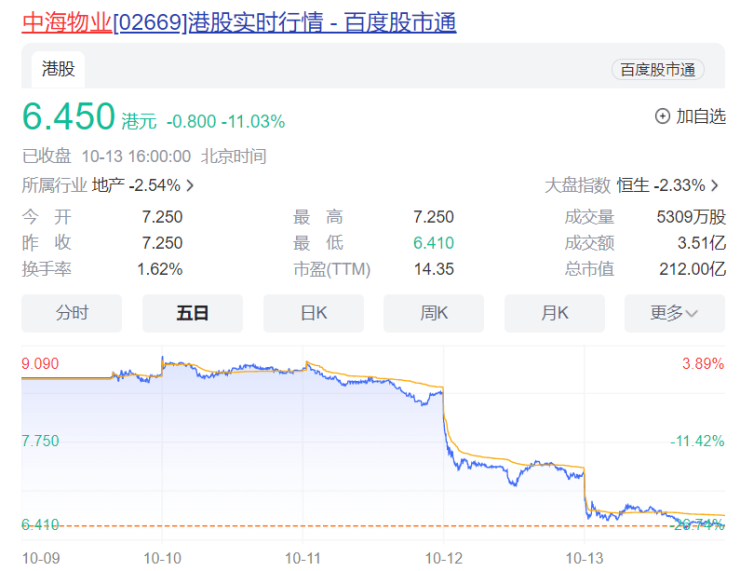 在收购公告发布后,中海物业股价连续两日跌幅超过11%,特别是在10月12日大跌14.81%,创下中海物业股价近一年来的最大跌幅。而10月13日收报的6.45港元,也是中海物业自2022年11月11日后录得的最低股价。