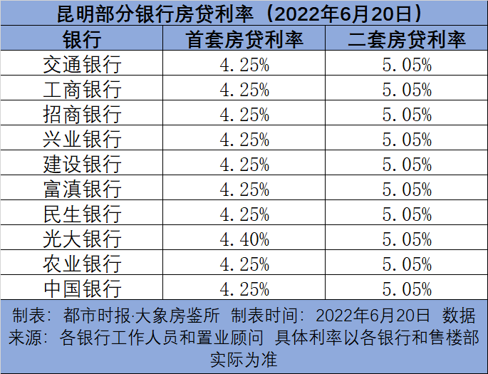 据都市时报·大象房鉴所记者了解,目前,昆明至少有9家银行首套房贷利率较低为4.25%。