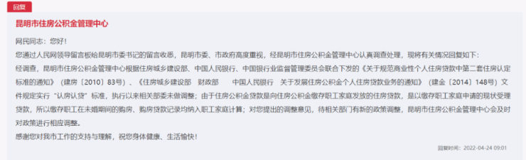此后便有网友在地方领导留言板上留言表示,昆明公积金“认房认贷”政策已实施多年,可能存在一些误伤刚需的情况,能否酌情调整。