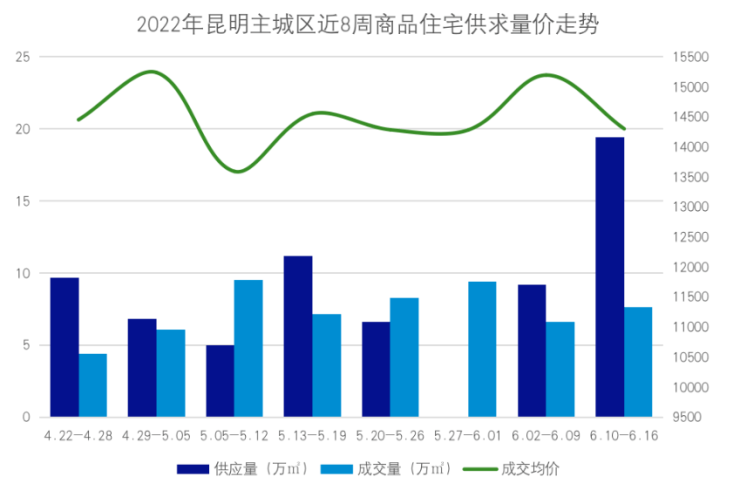 昆明房协数据显示,第24周(6月10日-6月16日),昆明主城5区商品住宅供销上涨,价格微降。主城区及呈贡区商品住宅新增供应19.41万平方米,环比上升112%;成交量7.65万平方米,环比上升16%,备案成交均价14161元/平方米,其中,剔除汇和紫薇园、建工新城等历史备案项目后成交均价为14302元/平方米,环比下降6%。
