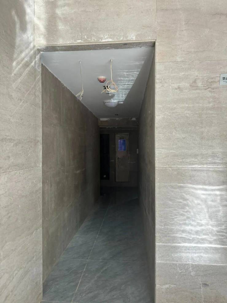 在小区单元楼内看到,单元楼门上还挂着电线,楼道内有电线悬挂,楼道内电井周边也有水泥散落。