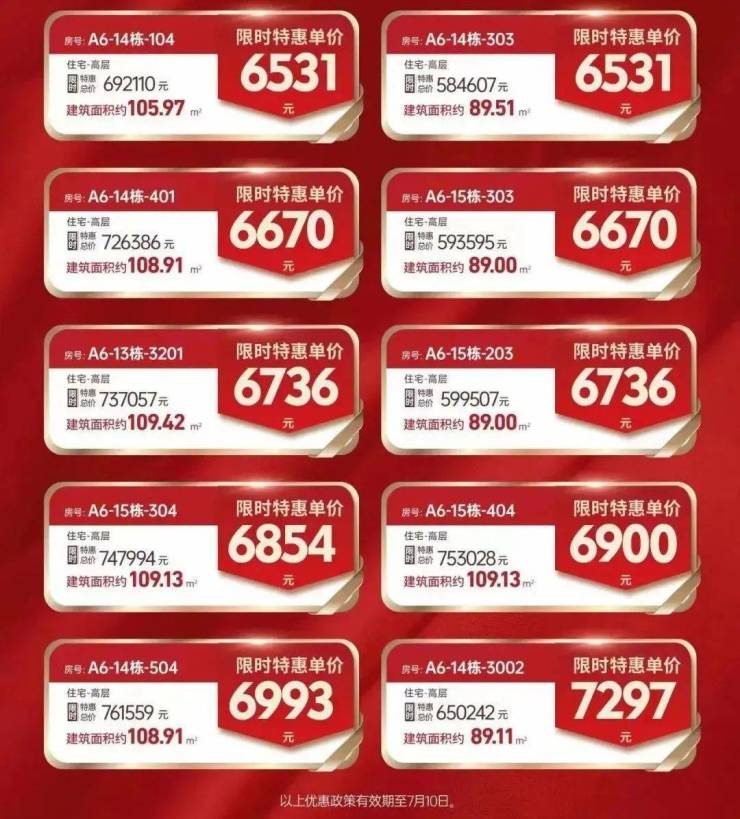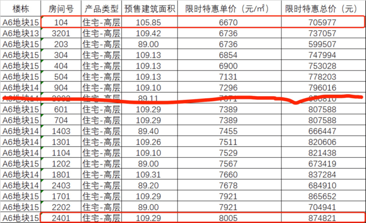 特价房源表还显示,特价房所在的是高层住宅,面积有89、105、109平方米三种,房源从1楼至32楼都有;特惠单价从6670—8005元不等。