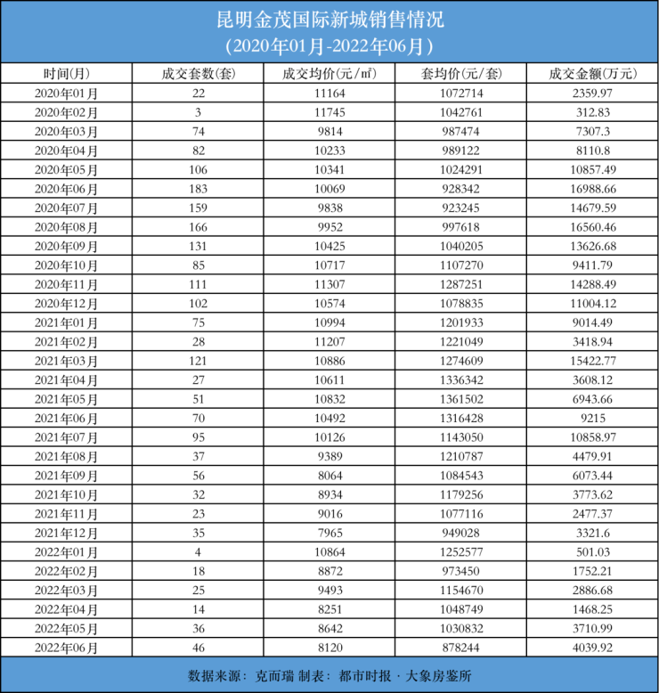 克而瑞发布的昆明楼市上周周报(7月11日—17日)显示,上周,金茂国际新城销售套数为17套,成交均价为7755元/平方米。