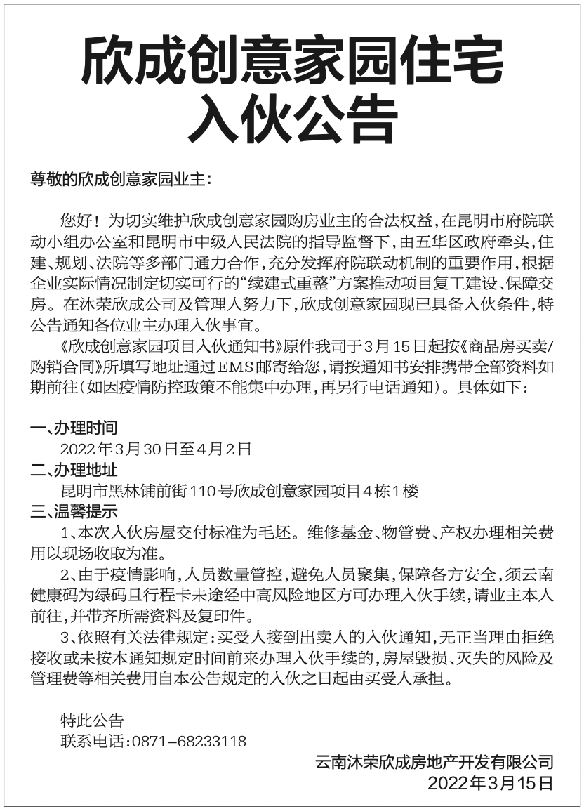 3月15日,云南沐荣欣成房地产开发有限公司发布《欣成创意家园住宅入伙公告》。《公告》显示,欣成创意家园已具备入伙条件,将于3月30日至4月2日为业主办理入伙。入伙房屋交付标准为毛坯,维修基金、物管费、产权办理相关费用将在办理现场收取。