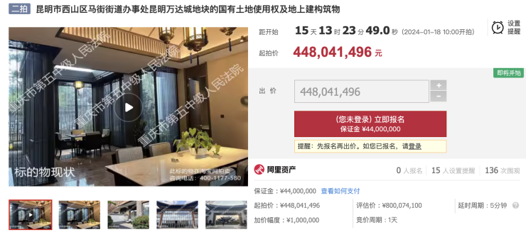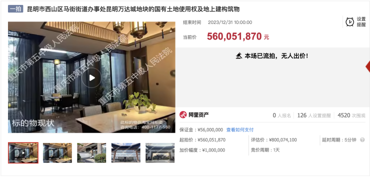 1月2日,据阿里资产网站消息,昆明市西山区马街街道办事处昆明万达城地块的国有土地使用权及地上建构筑物首拍流拍,起拍价约5.6亿元,评估价8亿元,拍卖方为重庆市第五中级人民法院。