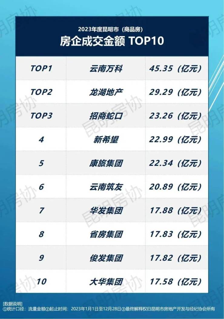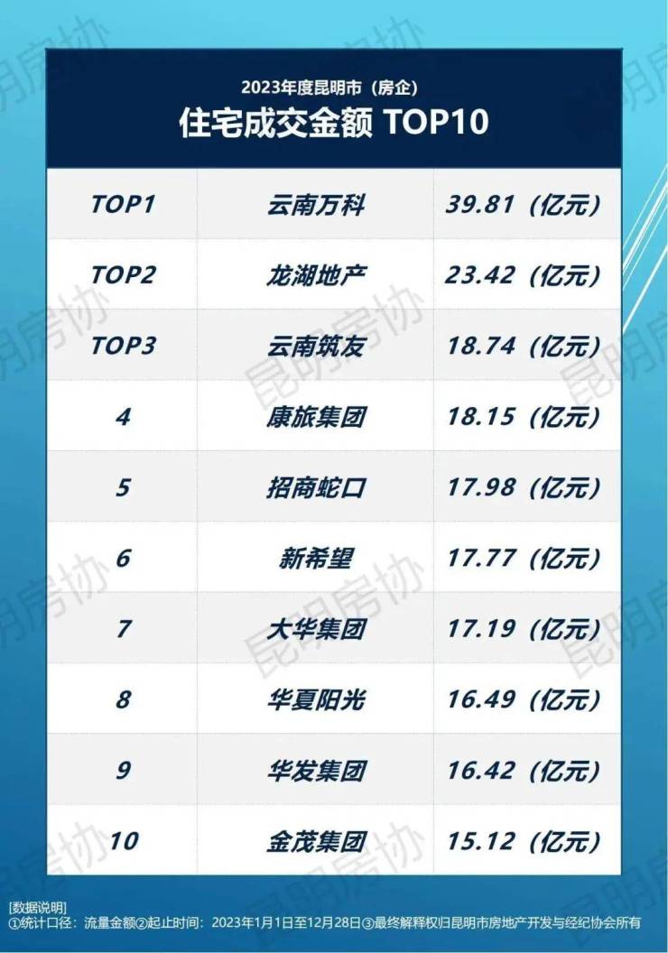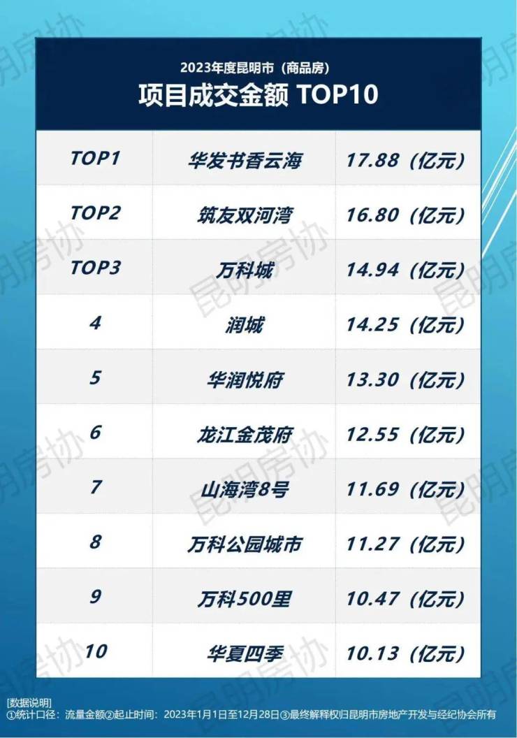 根据房协的《2023年度昆明市(商品房)项目成交金额 TOP10》,前十的项目分别是书香云海、筑友双河湾、万科城、润城、华润悦府、龙江金茂府、山海湾8号、万科公园城市、万科500里和华夏四季。