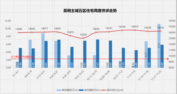 2023年第46周昆明楼市——成交量连续三周上涨,带动整体均价微涨。