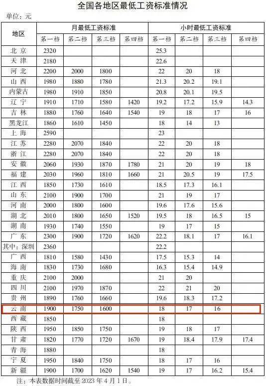 云南月最低工资标准第一档为1900元,第二档为1750元,第二档为1600元。